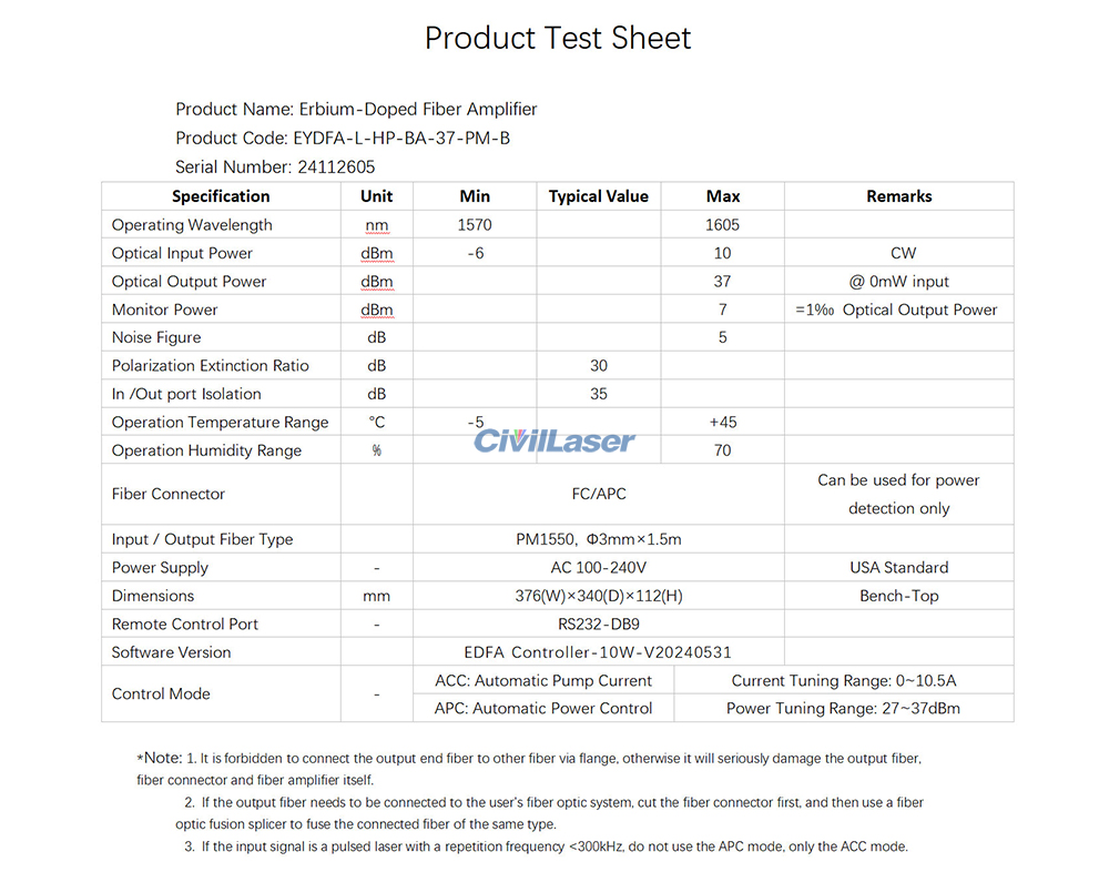 이 L 대역 37dBm 광섬유 증폭기 EYDFA-L-HP-BA-37-PM-B3에 대한 테스트 보고서입니다.